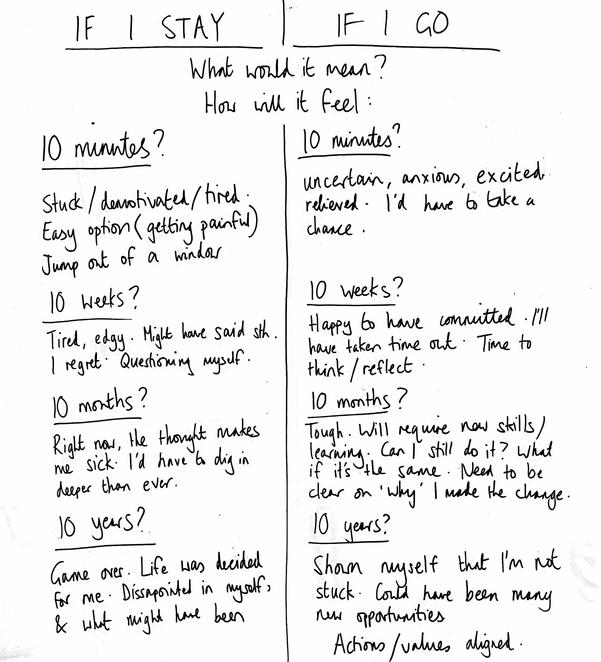 What would these options mean to you (and how would it feel) in ten minutes, ten weeks, ten months and ten years?